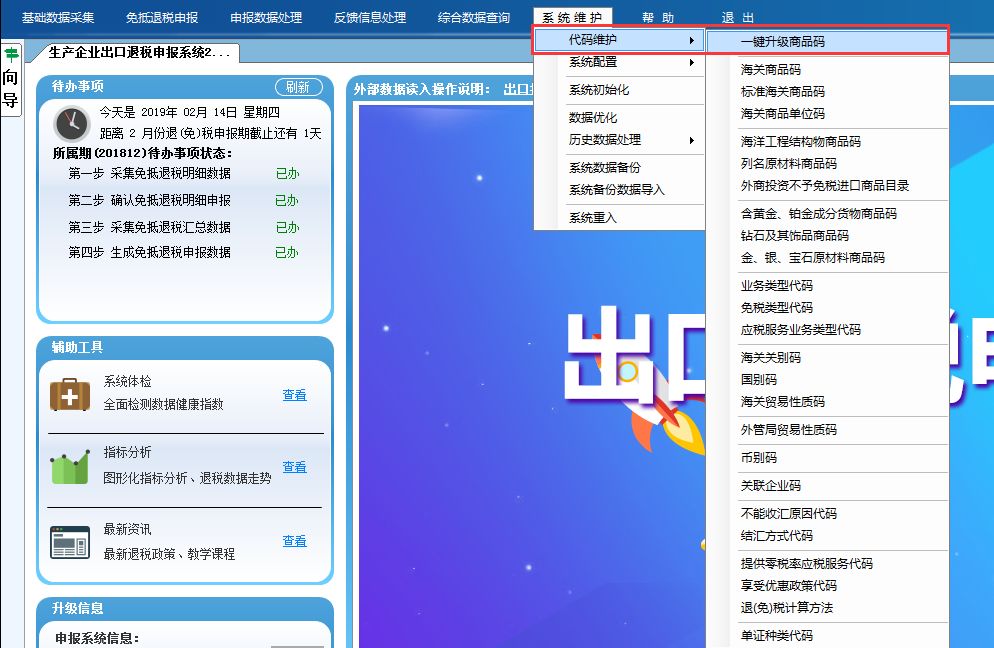 2.打开出口退税申报系统,点击“系统维护”→“代码维护”→“一键升级商品码”,选择下载的税率库文件,然后点击“确定”。